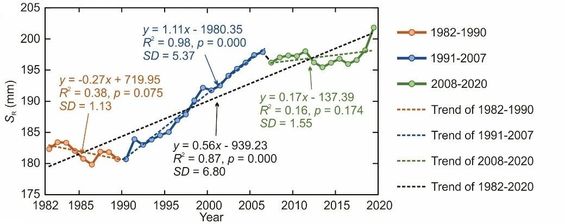 研究发现,在1982-2020年期间,全球平均根区蓄水能力从182毫米(有效水深)增加到202毫米,换算为体积蓄水能力则增加了16520亿立方米,相当于42个三峡水库的库容。通过基于过程的归因分析,发现这一增加趋势主要受到干旱期持续时间延长的影响。