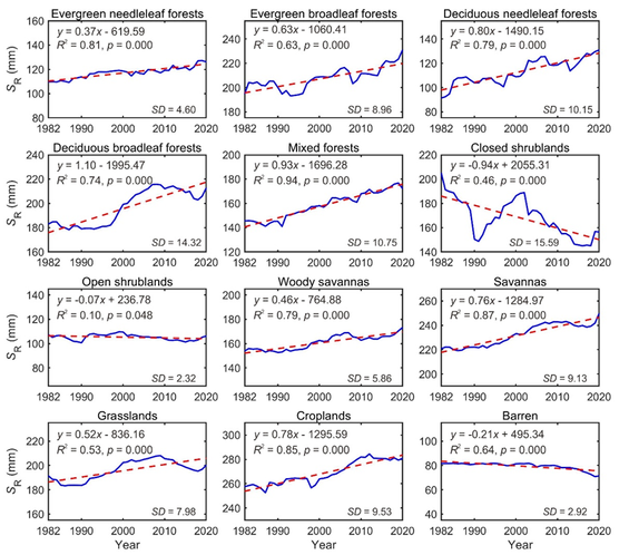 根区是植被的“地下水库”,是保证植被在干旱时期获取水分的关键。根区蓄水能力(SR)作为'地下水库'的有效库容,是水文模型和陆面过程模型的核心参数,是生态系统长期适应气候演化的结果。然而,根区分布于地下,SR难以直接观测,大尺度评估包括生态系统、流域、乃至全球研究等,尤为困难。更为重要的是,在气候变化这一全球性挑战的大背景下,不同生态系统的根区蓄水能力是如何动态演变的?根区动态演变的主要驱动因素是什么?哪些生态系统的根区适应气候变化的韧性增强,哪些可能面临退化风险?对于这些问题,目前还缺乏全球范围内的定量评估。