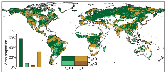 通过对比地上和地下生物过程的变化,我们发现在全球57%的植被区域,SR和叶面积指数(LAI)同步增加。这表明多数陆地生态系统一方面地上生物量增加,导致地球“变绿”;另一方面通过增加根区蓄水能力来适应日益严重的干旱。