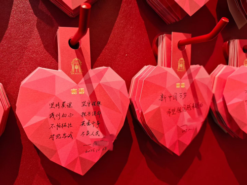 展馆的最后一幕,是天安门的影像。从石库门的启航,到天安门的光辉,中国共产党走过百年征程,始终与人民心连心。走出纪念馆时,五星红旗在秋日蓝天迎风招展,学生们在一颗颗“红心”上写下对祖国的祝福,也写下自己的誓言:以史为鉴、以学为基,行地理之道,担时代之责。