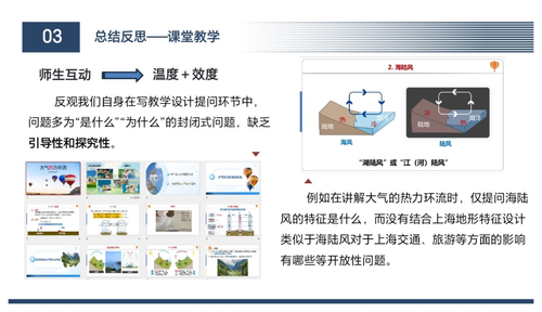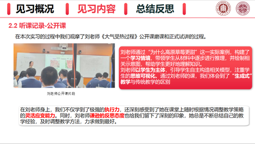 见习体悟:在观摩刘老师《大气受热过程》公开课及教研会后,我们深刻体会到“生成式”教学与传统课堂的差异。教研会中,老师们强调要通过支架为学生们搭建起学习知识的框架,老师备课时也要进行充分的课堂预设,并发展动态调整能力,让我们认识到以学生为主体的课堂需要教师更专业的支持与应变智慧。
