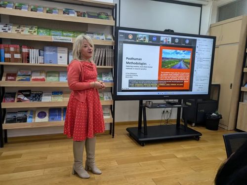 西德博顿博士在讲座中详细介绍了后人类研究方法论(posthuman research methodologies)跨学科、非线性和参与性的特点,展示后人类视角如何将人类中心伦理扩展到自然元素,如水、树木和动物,鼓励参与者重新审视人类与非人类之间的关系,为地理教育教学带来新视角和启发。