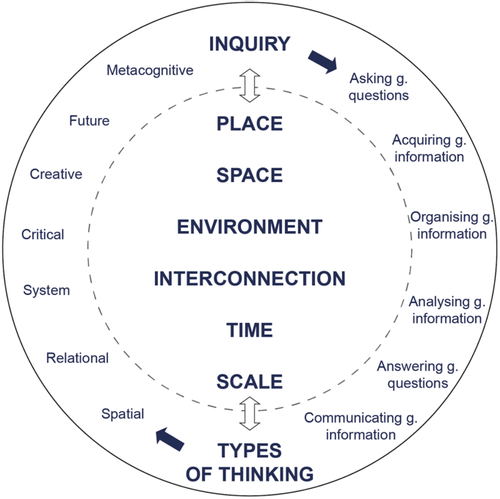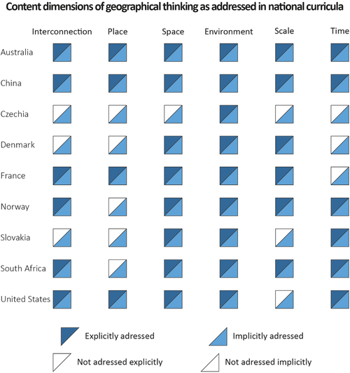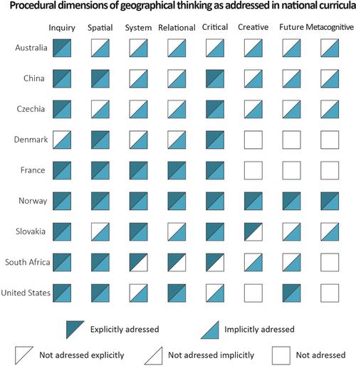 研究构建了一个从地理思维的角度分析不同课程的框架(见图2)。地理思维被概念化为两个维度:内容维度和程序维度。内容维度通过地点、空间、环境、相互联系、时间、尺度六个关键概念诠释。程序维度包括通过探究学习地理和通过不同的思维方式学习地理(空间思维、关系思维、系统思维、批判性思维、创造性思维、未来思维、元认知)。这种统一的方法为研究不同国家课程中的地理思维提供了一致的结构。