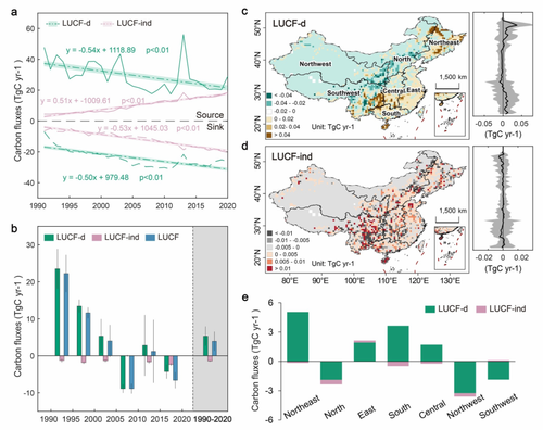 图3 显示了 1990–2020 年间土地利用变化(LUC)引起的直接(LUCF-d)和间接(LUCF-ind)碳通量。(a) 为 LUCF-d 和 LUCF-ind 的碳源总量(正值)与碳汇总量(负值)的年际变化;(b) 为 LUCF-d、LUCF-ind 及总 LUCF 的碳通量,按 5 年和 30 年期平均;(c–d) 展示了 30 年平均 LUCF-d 和 LUCF-ind 的空间分布,右侧图显示沿每 0.5° 纬度所有像素的平均值,浅色表示纬度平均值的标准差;(e) 为按区域统计的 30 年平均 LUCF-d 和 LUCF-ind。