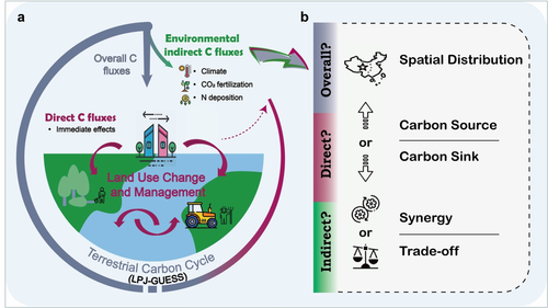 图1.土地利用变化(LUC)引起的直接和间接碳通量及本研究关注点的概念示意图。(a) 过程概览:区分由土地利用变化和管理活动引起的直接碳通量(LUCF-d,洋红色箭头)及其产生的环境间接碳通量(LUCF-ind,绿色箭头)。(b) 本研究的关键关注点:直接与环境间接的LUC引起的碳通量。