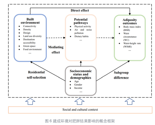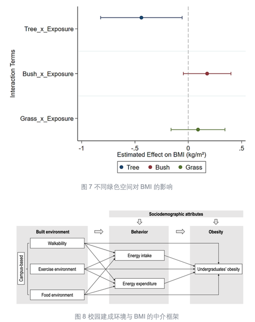 在全球范围内,精神健康与肥胖问题已成为日益严峻的公共健康挑战,其多重负面影响受到学术界和决策者的高度关注,且在包括青年群体在内的各年龄段中患病率显著攀升。研究团队基于中国29个省份89所高校超过两万名大学生的调查数据,探讨了校园邻里环境对中国大学生身心健康的影响。在心理健康方面,研究发现:(1)校园周边街道设计可通过影响PM2.5暴露,睡眠质量和膳食模式,进而作用于大学生心理健康(图3);(2)校园邻里公园可达性对改善中国大学生心理健康有显著的因果效应(图4);(3)中国城市邻里环境与社区归属感之间的关联,尤其是邻里互动和社区满意度的中介效应(图5)。针对肥胖问题研究围绕:(1)建成环境与三种客观肥胖指标(体质指数(BMI)、腰围(WC)和腰高比(WHtR))之间的联系(图6);(2)不同绿色空间类型对大学生肥胖的影响,并强调了区分绿色空间类型的重要性(图7);(3)食物摄入、体育锻炼和积极出行是否作为中介因素存在于校园建成环境与身体质量指数(BMI)之间的关系(图8)。