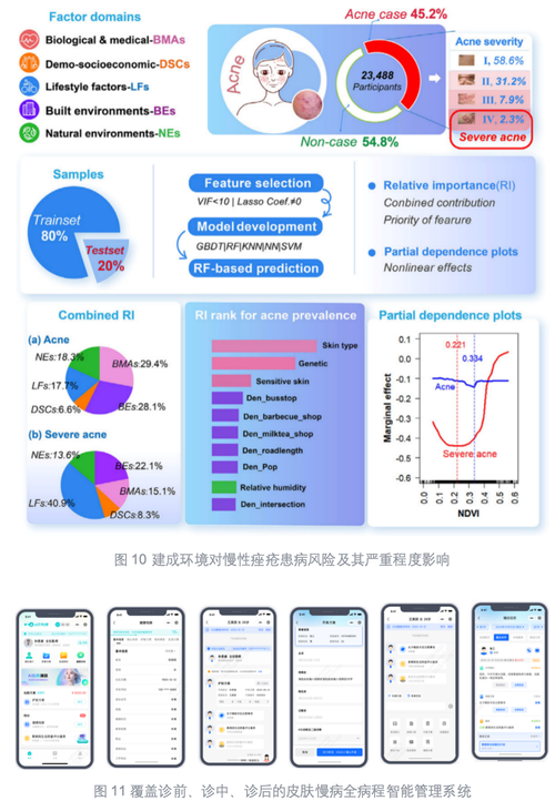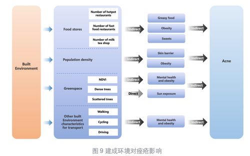 过往研究多集中于研究传统身心健康(肥胖、抑郁等),但伴随城市化进程,环境变化和生活方式的转变显著增加了皮肤的健康负担,因此有必要在前述的基础上进一步探索环境-行为-皮肤健康之间的关联关系。其中痤疮作为一种常见的非传染性慢性疾病,多发于青春期并可能持续至成年期。考虑到空气污染物是全球公认的健康危害,因此,团队基于对空气污染物在痤疮继发性敏感皮肤中的作用进行流行病学调查,覆盖中国七个主要地理区域的70家医院的4000多名患者。研究采用机器学习方法研究了空气污染物、个体社会经济学属性和生物因素与痤疮继发敏感皮肤之间的关系。此外,团队通过综述研究全面评估个体和环境(自然、社会环境)对痤疮的影响,并构建一个关于建成环境影响痤疮的理论框架,来理解建成环境与痤疮之间的间接关系(图9)。后续,基于全国90所高校本科生的环境流行病学调查数据,采用最优随机森林模型进行研究,发现建成环境是痤疮患病及其严重程度的第二大类预测因素,以及痤疮与关键建成环境因素的非线性关系(图10),强调在预防、诊断与管理痤疮时应考虑建成环境的作用。