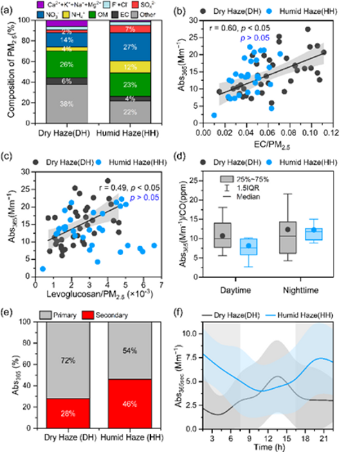 基于相对湿度(RH)差异,,作者将观测期间的霾污染分为干霾(DH)和湿霾(HH)两种类型,发现PM2.5在化学组成上表现出显著差异。DH中二次无机气溶胶(SNA)占比仅为20%,相比之下,HH中SNA占比显著升高至46%。在DH期间,生物质燃烧示踪物(左旋葡聚糖)以及化石燃料燃烧示踪物(EC和PAHs)均与BrC光吸收(Abs365)呈显著正相关,但在 HH 期间未观察到显著相关性,表明DH中BrC主要来自一次排放,而湿润条件下二次生成过程更为显著。在DH期间Abs365/CO 比值在昼夜尺度上未表现出显著差异,相比之下,HH期间夜间Abs365/CO比值显著高于白天,显示夜晚高RH条件有利于 BrC 的二次生成。基于 EC 示踪法估算,作者发现DH 期间二次形成对 BrC 的贡献率为28%,而在 HH 期间升高至 46%。此外,二次 BrC 在两类霾污染期的昼夜分布特征呈现相反趋势:DH 期间白天二次 BrC 占比更高,而 HH 期间则是夜间占优,进一步表明夜间二次反应在HH时期 BrC 形成过程中起到关键作用。