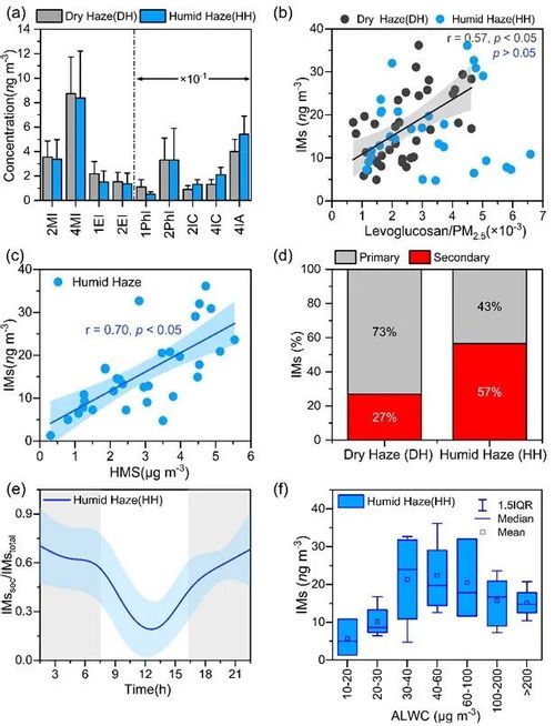 IMs是BrC 中一类重要含氮发色团,观测期间的数据显示:香河站点大气IMs 浓度(16.5 ±6 ng/m3)为我国南方城市浓度的3倍(如上海,5.5 ± 3.4 ng/m3)显示华北平原冬季棕碳污染较南方严重。两类霾污染期,烷基咪唑(如 2/4-甲基咪唑、1/2-乙基咪唑)为主要物质,分别占总 IMs 的 94%(DH)和 91%(HH),但HH中 IMs/OC 比值及氧化型咪唑/烷基咪唑比值显著升高,表明HH中 IMs 的氧化程度更高。在DH中IMs 与生物质燃烧示踪物(左旋葡聚糖)呈正相关,显示其主要来源于一次排放;而在HH中IMs 与液相反应示踪物(羟基甲磺酸)强相关,显示液相反应在湿霾期 IMs 形成中扮演主导角色。在此基础之上,作者进一步定量计算发现:二次生成 IMs在DH中的贡献率仅为27%,而在HH中则高达 57%,且湿霾中二次IMs 在夜间占比更高,显示夜间气溶胶液相化学对IMs的二次生成起到主导作用。