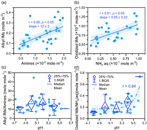 在二次生成过程中,气溶胶液相游离态氨分子(NH3(aq))与有机胺类物质是IMs形成的前体物,二者与羰基化合物在气溶胶液相中发生羰氨缩合反应,形成IMs。HH期间霾粒子PM2.5中游离态氨(NH3(aq))和有机胺浓度均显著高于DH期间。烷基咪唑与有机胺呈显著正相关,而氧化型咪唑则与NH3(aq)呈显著正相关,且两类 IMs 之间无显著相关性,表明二者形成路径不同。在 IMs 的生成效率方面,有机胺生成咪唑的效率比NH3(aq)高1个数量级,且烷基咪唑(有机胺产物)浓度显著高于氧化型咪唑(NH3(aq)产物)。此外,烷基咪唑与胺的比值无显著 pH 依赖性;而氧化型咪唑与 NH₃(aq) 的比值则随着 pH 升高呈指数增长。这是因为与NH3不同,有机胺的氮原子连接烷基(供电子基团),通过供电子效应提升有机胺N原子上的电子云密度,进而增强其与醛的亲核加成反应,从而导致二者在 IMs 生成中的效率和 pH 依赖性的差异。