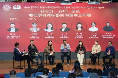 培训活动的第二场圆桌座谈为教研员、教师一席谈:浙江省地理教研员郭剑峰、江苏省地理教研员于蓉、甘肃省地理教研员赵兴、陕西省地理教研员贺辉、上海市川沙中学校长王珏、上海市教育考试院地理学科秘书闪德龙参加座谈,段玉山教授主持座谈。本次座谈围绕地理课程标准在不同省域的实施现状展开讨论,聚焦地理实践活动设计、课程实施监测、考试命题改革以及义务教育与普通高中衔接等关键问题,呈现了地理课标落实在不同区域的多样路径与共性挑战,为深化高中地理课程实施提供了有益借鉴。