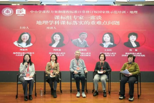 培训活动的第一场圆桌座谈为课标组专家一席谈:地理课标组核心成员、北京师范大学地理科学学院周尚意教授,地理课标组核心成员、人民教育出版社高俊昌编审,地理课标组核心成员、中国海洋大学海洋地球科学学院王永红教授,地理课标组核心成员、济南市教育科学研究院正高级、特级教师程菊参加座谈,地理课标组秘书、人民教育出版社周盈科副编审主持座谈。本次座谈主题为地理学科课程标准落实的重难点问题,围绕如何理解“课程内容”的设计思路、教科书对地理课标的落实策略以及过程性评价在地理教学中的实施三个主题展开,为参会人员深化理解课标、落实课标提供了针对性的指导。