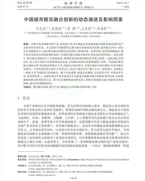 研究发现,受国家战略驱动、数字技术革新和大国科技博弈影响,中国数实融合创新存在明显的阶段性特征,其技术重心经历了从基础连接、物理改造到系统控制的转移。交通运输、医药医疗、电力动力等新兴应用领域发展迅速,主要城市的相对优势领域趋于多样。空间格局呈现“沿海城市群地区主导、内陆省会城市集中、其他区域水平相对薄弱”的非均衡发展格局,高水平城市存在“数字主导—浅度融合、浅度融合—制造主导”的渐进式演化路径。数字企业规模、制造企业规模、企业研发合作、外部技术引进、政府研发投入、金融发展水平和全球化水平是促进本地数实融合创新的重要因素,而政策激励的推动作用仍待凸显。数字企业规模和政府研发投入同样对邻地数实融合创新存在积极影响,城市经济规模则相反。