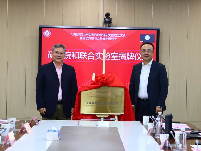 华东师范大学副校长施国跃、北京师范大学副校长汪明、中国科学院新疆生态与地理研究所副所长孙福宝、应急管理部国家减灾中心副主任贾汀为华东师范大学灾害风险管理研究院揭牌。华东师范大学地理科学学院院长张国友、中国人保集团保险部总经理彭钢为华东师范大学地理科学学院-中国人保集团保险科创实验室联合实验室揭牌。见证揭牌的与会专家还有清华大学安全科学学院袁宏永院长、应急管理部国家减灾中心综合风险监测预警中心郭桂帧主任、中国气象局上海台风所余晖所长。华东师范大学科技处处长杨海波教授、地理科学学院党委书记王军教授及地理科学学院许世远教授、陈振楼教授、殷杰教授等多位华东师范大学领导与相关领域学者出席了会议。