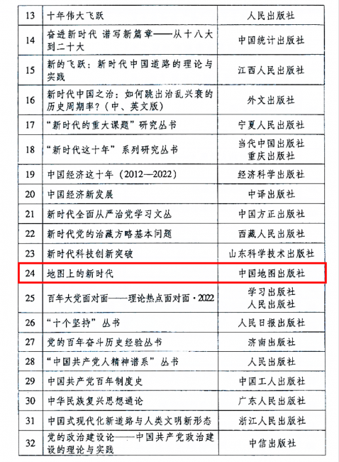 华东师范大学地理科学学院党委书记段玉山教授主编的校四史教育成果《地图上的新时代》获“中央宣传部2022年主题出版重点出版物”选题,本次选题以突出迎接宣传贯彻党的二十大工作主线,充分发挥重点出版物的引领示范作用,在全社会形成唱响主旋律、传递正能量、提振精气神的浓厚文化氛围。