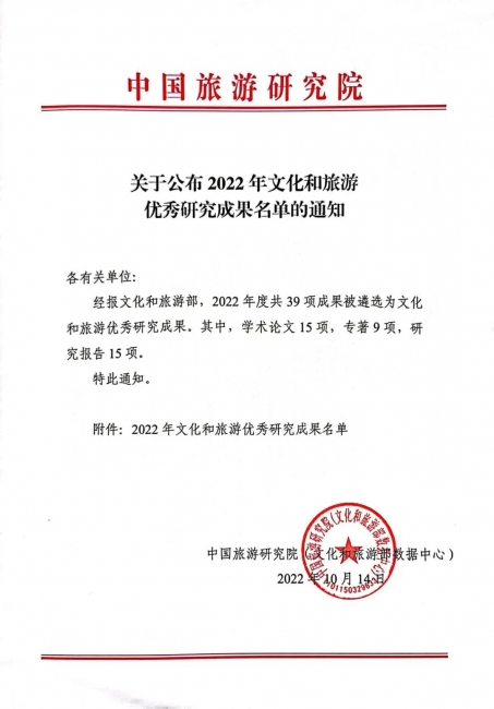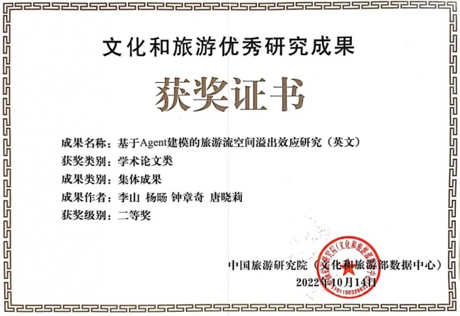 近日,经报文化和旅游部,中国旅游研究院(文化和旅游部数据中心)公布了2022年度文化和旅游优秀研究成果名单,地理科学学院李山副教授团队的论文《基于Agent建模的旅游流空间溢出效应研究(英文)》喜获二等奖。