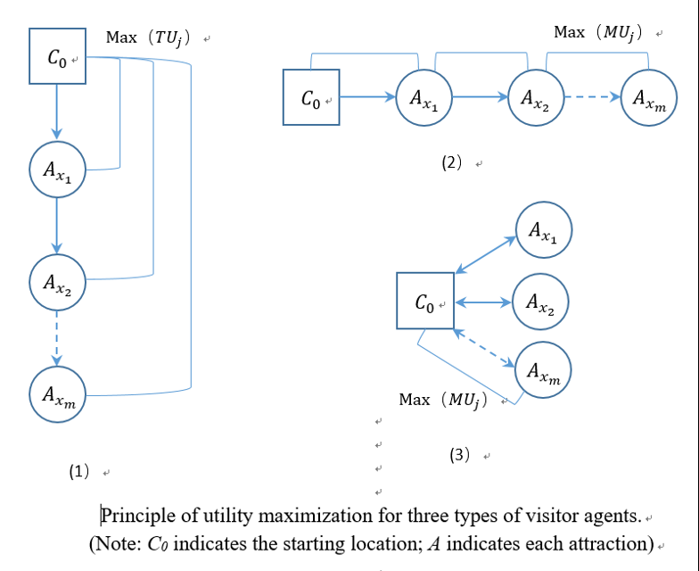 2)制定Agent行为规则。将游客Agent划分为3种基本类型,即全局优化者(global optimizers,观光型)、移步优化者(sequential optimizers,漫游型)和往返优化者(radial optimizers,度假型),根据“游旅比”效用追求差异制定不同的景区(吸引物)选择行为规则。
