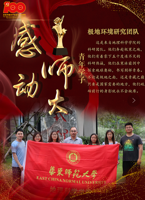 华东师范大学极地环境研究青年团队以习近平总书记提出的“要更好的认识南极、保护南极、利用南极!”为指导,深入开展了极地科学研究。团队负责人为华东师范大学地理科学学院教授、国家优秀青年科学基金获得者史贵涛。