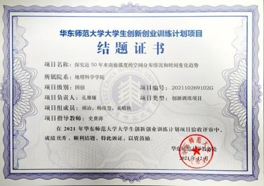 以青年团队成员为支部书记和骨干的华东师范大学本科生协同育人党支部就是极地科学研究和精神传承最好的载体,通过这一支部成功搭建了学生和教师沟通的桥梁,将研究和育人深入结合。在极地科学研究方面,青年团队积极探索育人新模式,指导本科生完成了多项极地科学研究科创项目,指导本科生完成了华东师范大学大学生创新创业训练计划项目,获得上海市级优秀;指导本科生完成了国家大学生创新创业训练计划项目获得优秀;指导本科生完成了毕业设计,获得了校级优秀,等等,将极地的前沿研究融入到育人过程中,显著提升了育人质量和水平。