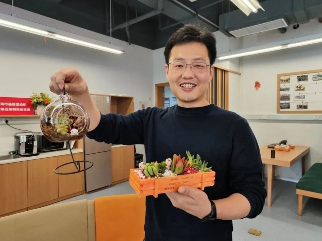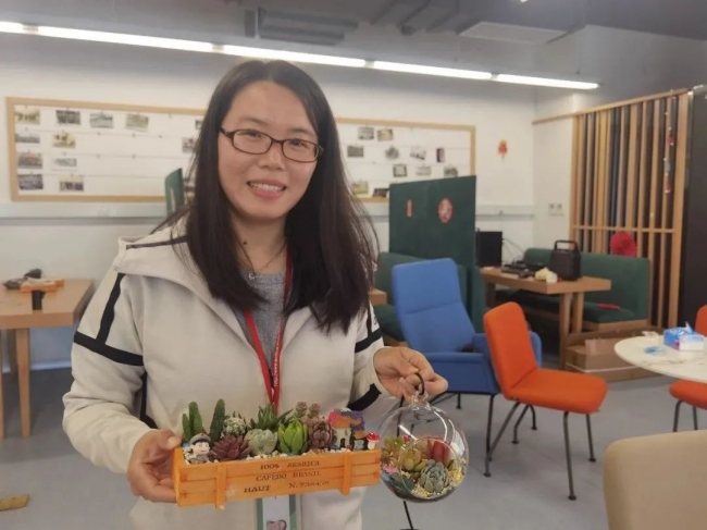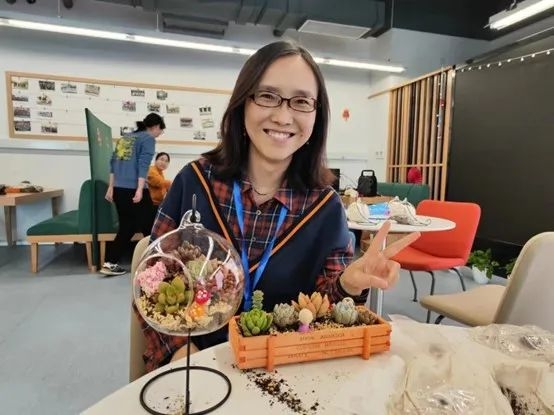 每位老师现场DIY制作专属的春日春景。加土、挖洞、种植、压实、盖砂石、放装饰……老师们充分发挥自己的创意想象力,变身巧手花匠,摆出各种各样的创意造型。一盆盆多肉盆栽呈现在大家面前,成为美丽地理学院的“新成员”,参与活动的老师们都沉浸在欢乐中。