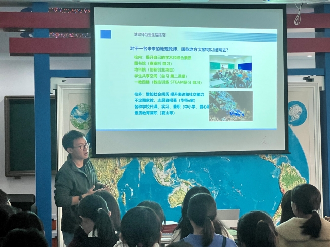 活动开始,学院党委书记段玉山教授以学院历代名家大师、教育工作者们为榜样,向初入地理学大家庭的新生们介绍了老一代地理人在校期间的学习和工作经历。段玉山教授勉励地理科学(师范)专业的新生们树立远大目标,牢记华东师范大学校训,珍惜大学四年的宝贵时光,传承好地学人的精神和情怀,充分利用学院的资源及平台,脚踏实地,开拓眼界,培养教师教育技能,为将来实现自己的人生价值做好充分的准备。