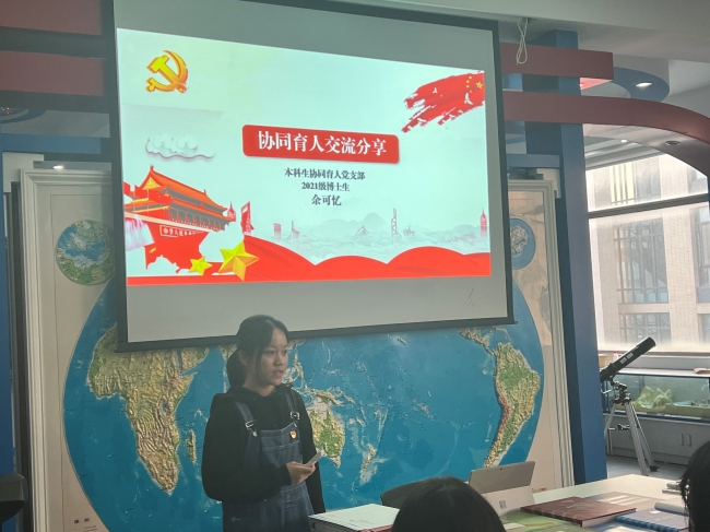本次活动还邀请了孟宪承书院学生第一党支部、2018级地理科学(师范)专业本科生辛维豪同志与本科生协同育人党支部、地理科学学院2021级博士生余可忆同志介绍自己在华东师范大学的学习和科研经历,两位同志为大家分享了如何充实有效的度过大学四年的生活。辛维豪同志建议同学们要不断提升自己的学术和教师综合素质,增加社会阅历,努力提升自己的硬实力和软实力,并且祝愿大家能够找到自己在大学的意义。余可忆同志倡议同学们要不断夯实专业知识,在有余力的条件下积极参加学术讲座、科研活动,同时要加强体育锻炼,培养团队交流沟通能力。