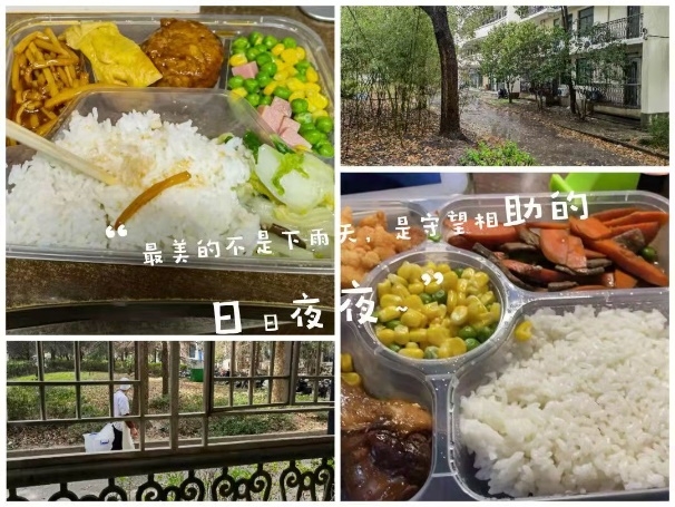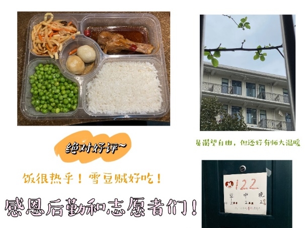 3月20日,2021级学硕团支部以“一顿饭,一句话”为主题开展线上主题团日活动,以隔离期间的餐食为切入点,感恩校园保障人员和志愿者们的辛勤付出,组织支部团员为自己的“盲盒”午餐拍一张靓照,同时附上自己写的一句话,表达隔离期间的心声。支部团员踊跃纷纷参与,用各种创意和形式,或表达对华师大的感谢、对保障工作者和志愿者的敬意、对战胜疫情的必胜信心、打开盲盒的惊喜等,以在微信群聊天、发照片的形式进行,在轻松愉快的氛围中,增进了同学间的互相交流,改善支部团员在隔离期间的心理状况、倾听团员心声,切实激发大家热爱校园的情感和战胜疫情的信心,促进支部团结,携手共抗疫情。