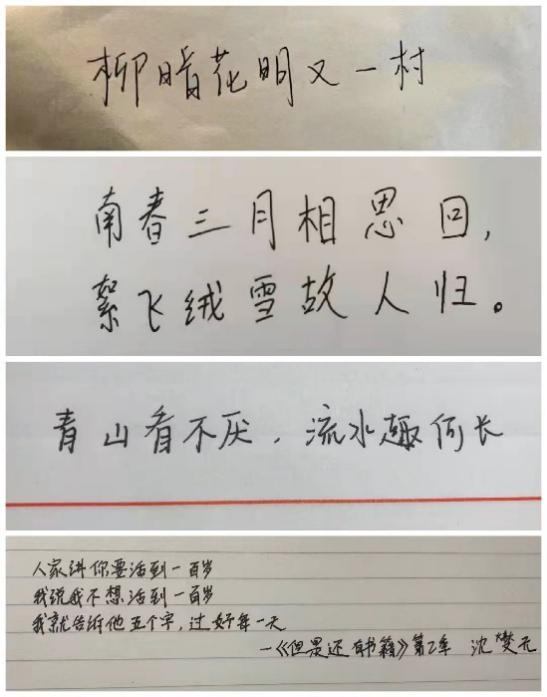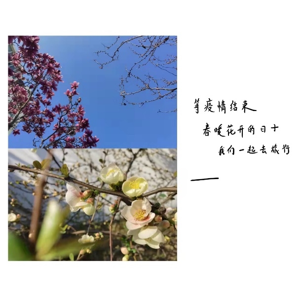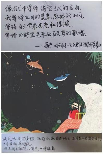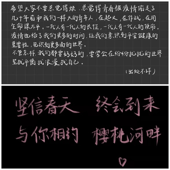 3月21日,2021级专硕团支部开展线上主题团日活动,号召大家手写一句“诗词/歌词/文学作品照抄”或是自己内心的所思所想,来抒发对疫情中或者疫情后的身边人或世界的感念与畅想。同学们踊跃参与,积极分享,通过图文并茂的作品,在线上一齐交流自己疫情期间的所思所念所感,互诉心声。大家的作品形式多样,内容丰富,有歌颂春天、期待自由的好心情,有疫情封闭期间积极乐观的人生态度,有诉说思念、遥寄真情的甜蜜细语,还有劝君惜取少年时、不忘初心,牢记理想的勉励……本次主题团日活动,舒缓了疫情期间同学们的心理压力,削减了负面情绪,促进了同学们的身心健康发展,同时也增进了支部内同学间的情感。