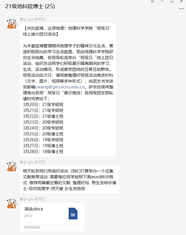 由临时党支部统筹,联合学院研究生会,建立班团轮值制度,举办“班级日”线上接力团日活动,营造积极阳光的学习生活氛围,展现地理学子众志成城、敢于担当、共抗疫情的精神风貌。