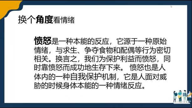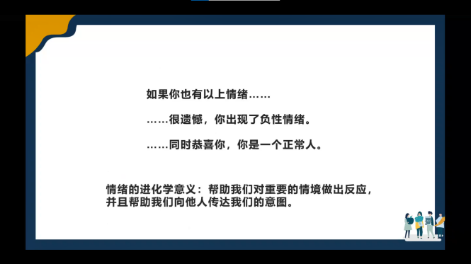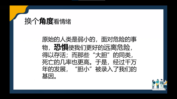 陈老师告诉大家,如果大家在这段时期也出现过这些负面情绪是正常的,要从进化心理学的视角来看待负面情绪,它能够帮助我们对重要的情境做出反应,并帮助我们向他人传达我们的意图。因此,同学们要学会接纳自己的恐惧、焦虑、愤怒等负面情绪,调节情绪、控制情绪并不是要让情绪消失,需要做的是解码情绪带给我们的信息。