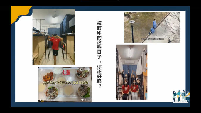 陈洁宇首先老师和大家互动,询问大家“现在都被封印在哪里?”“被封印的这些日子还好吗?”。而同学们纷纷表示自己现在被封印在公寓宿舍中,但同时大家都肯定自己的生活需求有保障。陈洁宇老师以自己被“封印”二十余天的经历为例,分享了从恐惧,转为焦虑、担心,渐渐有些愤怒,最终安心的情绪历程。