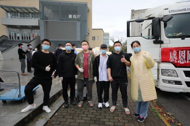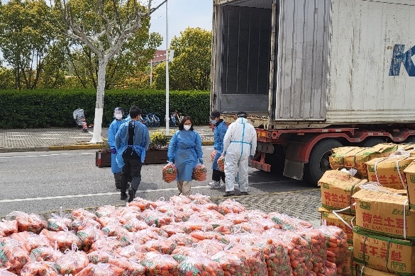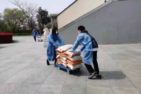 罗艺同师生一起搬运大米、水果、蔬菜等各类生活物资