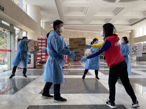 院团委书记 王纯(左一)分发生活物资
