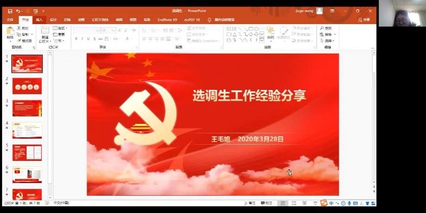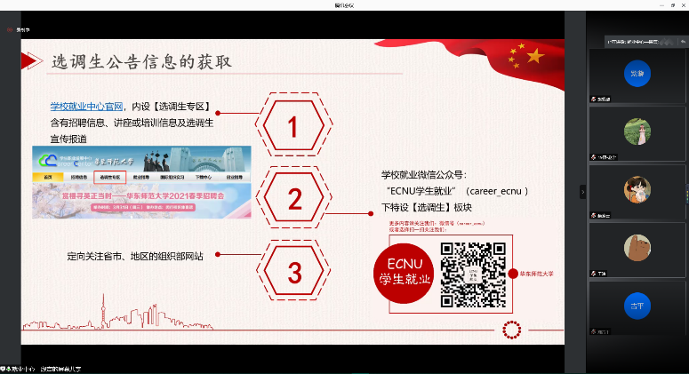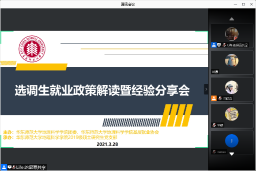 为进一步响应国家号召,引导地理科学学院学子赴基层一线就业,去到祖国需要的地方,传承老一辈地理人的精神,用专业服务地方发展。地理科学学院党委组织成立基层就业协会,围绕育人的中心目标,将党建与就业相融合。 3月28日上午,基层就业协会迎来首场活动,由地理科学学院2019级硕士研究生党支部承办的“选调生就业政策解读暨经验分享会”以线上的方式开展。会议邀请了华东师范大学学生职业发展中心市场信息部主管段言老师,以及4位已步入选调生行列的校友,为同学们进行选调生政策解读及经验分享,地理科学学院党委副书记(挂职)罗艺一同出席了本次会议,会议由地科科学学院团委书记王纯主持。