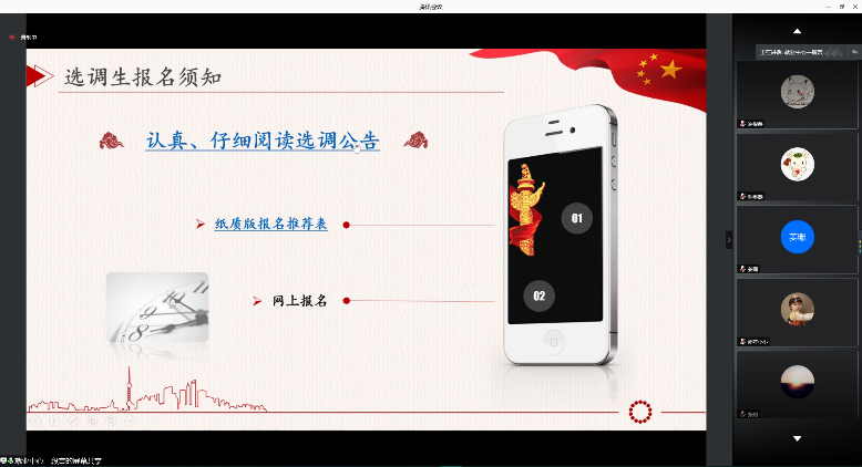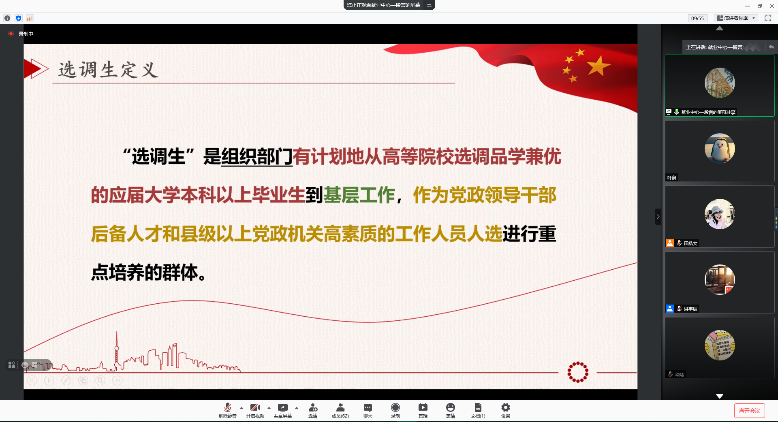会议伊始,段言从选调生的来源、工作内容、培养性质及人事归属等方面对选调生的定义进行了系统的解读,并从短期和长期发展两个方面概括了应届毕业生报考选调生的优势。段言提到,选调生的报考条件主要包括两个方面:一是选调生的基本条件,包括国籍、政治素质、学业成绩、年龄及遵纪守法情况等;二是优先/必要条件,包括政治面貌、实践任职、所获奖励及荣誉等。在基本条件相近的情况下,选调生的录取将按择优的原则进行。