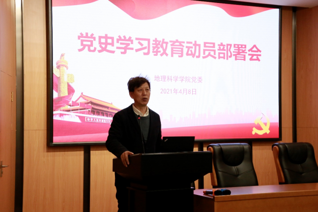 4月8日,地理科学学院党史教育动员大会暨全院教师大会在河口楼B101举行。大会由学院党委书记段玉山教授主持。