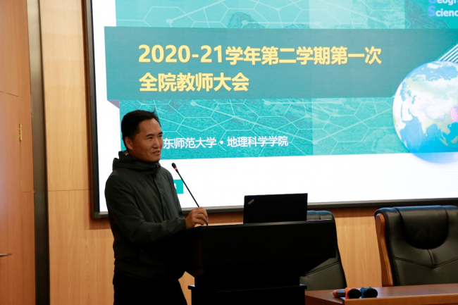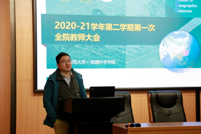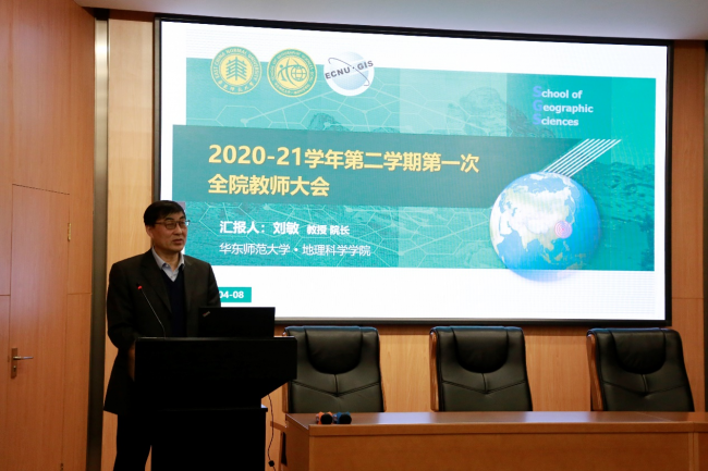 院长刘敏回顾了学院2020年主要工作进展,重点回顾了立足评估年,地理学“双一流”学科建设评估圆满完成,地理学博士后流动站获评“优秀”,地理科学入围新一轮“拔尖2.0”计划,地理学拔尖计划-焕庸班正式启动。刘敏通报了学院卓越人才培养和课程卓越建设的现状,重点强调了“地理科学” 本科专业培养方案。随后,刘敏介绍了学校近期重要工作,他表示,学院在人才培养、一流课程建设等方面取得了诸多成绩,离不开学院教师勠力同心,希望各位老师充分了解学校政策,并与个人发展规划相结合,学院上下齐心迎接挑战,取得更多成绩。