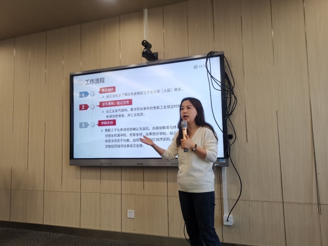刘萍首先介绍了学校基础教育与终身教育发展部近年来在教职工子女入学方面所做的工作,接着介绍了华师大在沪的附属学校基本情况,以及教职工子女入学报名的工作流程。