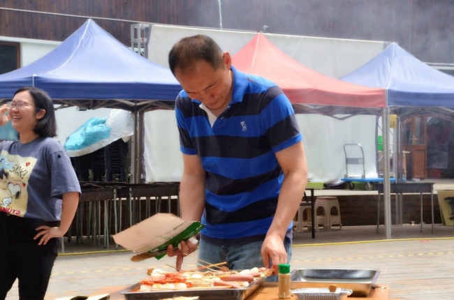 有的老师聚集在桌子旁,一起开始热热闹闹地聊生活、聊学问,都沉浸在愉快的氛围中。活动现场有指点声、欢笑声、喝彩声,汇成了和谐欢乐的海洋,好一派热闹祥和的景象。有老师笑称“好老师标准:既能在七尺讲台上课,又能在三尺烤架上烧烤”。