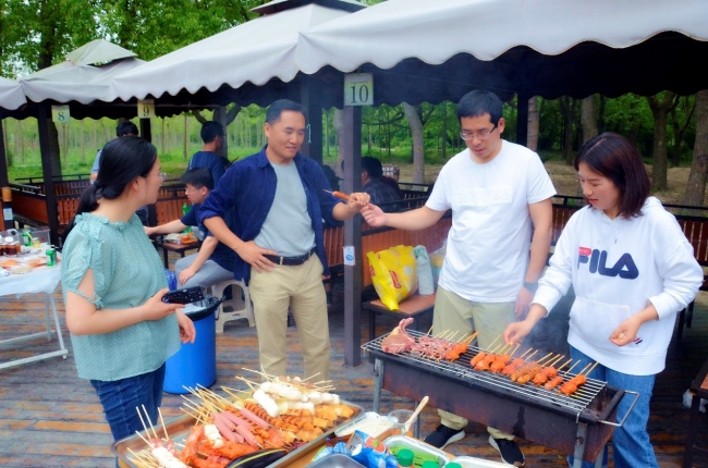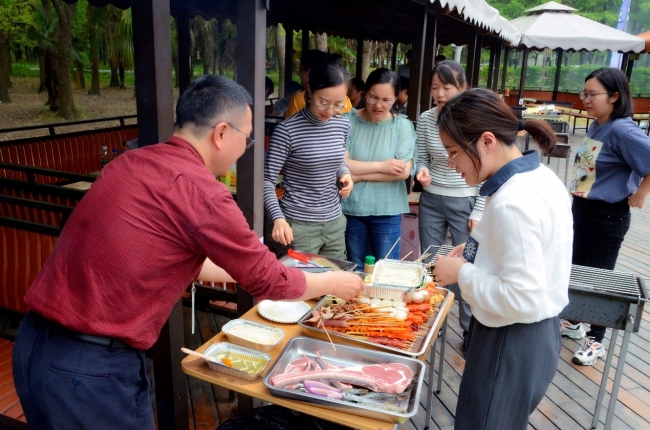 接着,大家聚集在烧烤场地,按照预先的分组落座。领材料,加炭起炉子,包锡纸,支网架,准备烧烤,大家忙的不亦乐乎。不一会儿,一道道香喷喷的烧烤大餐就摆在了众人面前,笑容展现在每个老师脸上。大家边烤边吃、边吃边聊,各组之间还不忘共享美味,在协作和关爱中,充分享受“自己动手、丰衣足食”的乐趣。