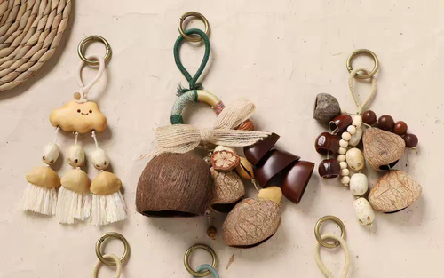 果壳、彩绳与串珠相遇,就能变出一串别致的果壳铃。亲手将它们串联打结,挂在窗边迎风,或是握在掌心轻摇,听果壳碰撞出清脆的回响,让心绪在不知不觉中舒展。