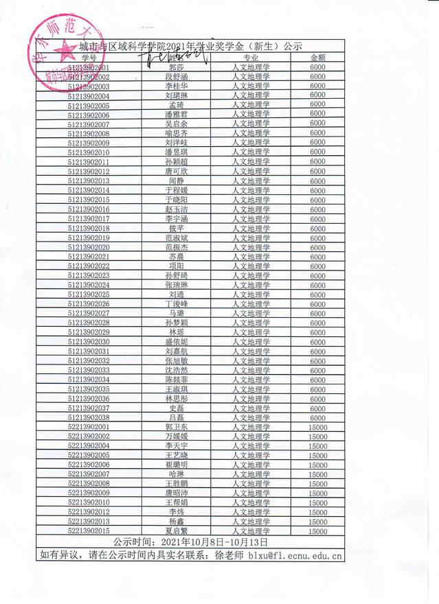 城市与区域科学学院2021年学业奖学金(新生)公示