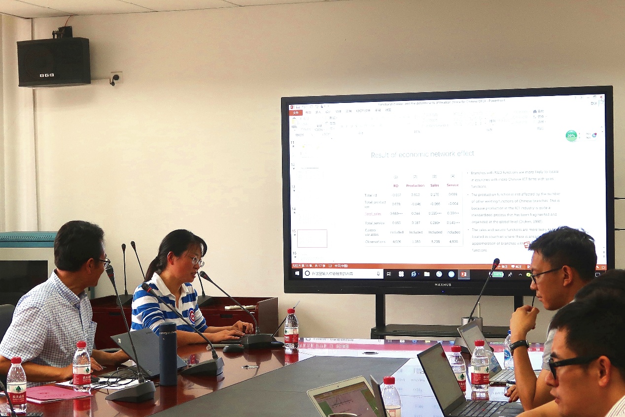 王俊松老师以《Functional division and the determinants of location choice for Chinese OFDI:the case of ICT enterprises》为题作了报告,研究目的在于企业的同职能部门在区位选择上是否存在差异,受到何种因素的影响,以及职能之间的垂直联系是否影响对外直接投资。王老师运用条件逻辑模型,将政治因素、文化距离和地理距离等要素构建起中国ICT企业对外投资的影响因素评价体系,结果发现企业不同的职能部门在区位选择上存在显著差异,而中国族裔网络和部门的空间集聚是最重要的影响因素,而政治风险对投资没有显著影响。