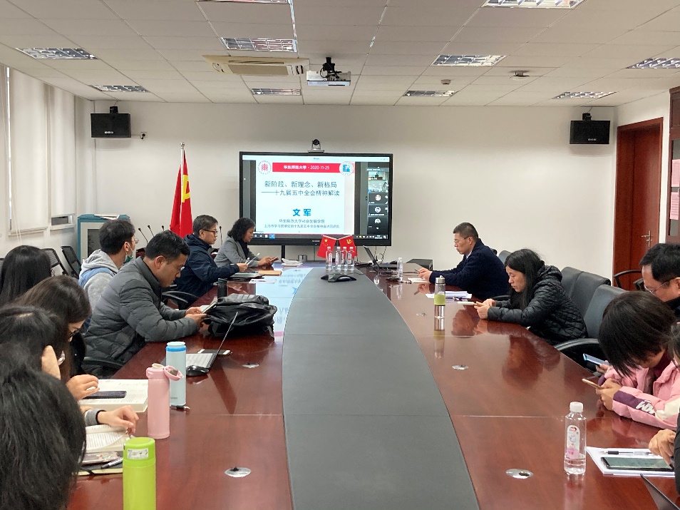 首先,大家参加了地学部副主任、城区学院院长杜德斌教授所做的报告:对中国科技发展的几点认识--学习十九届五中全会精神的体会。杜老师根据党的十九届五中全会提出的“将创新提到现代化建设全局中的核心地位、加快我国科技自立自强”的要求出发,重点分析了中国科技发展的发展现状、存在问题、突破路径及大学担当等内容。其中,杜老师提出,应该大力支持企业自主创新、整合推进产学研深度融合、加强高校培养创新人才使命等观点,得到了广大师生的共鸣和认同。