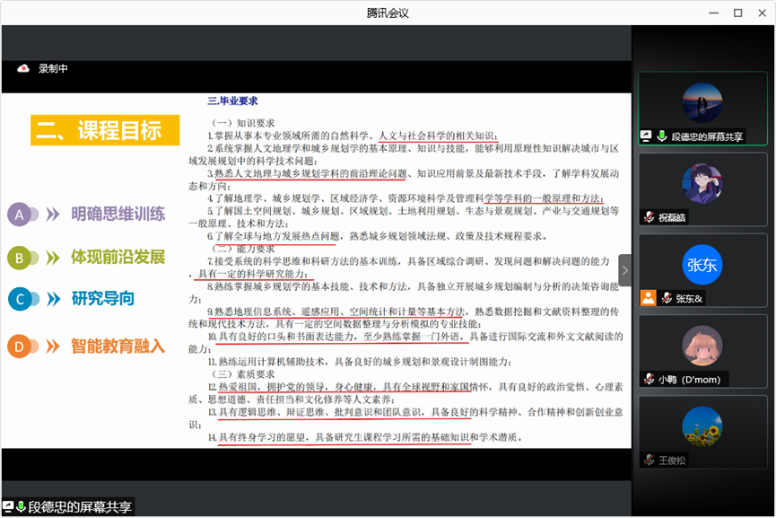 段德忠老师对自己拟开设的《全球科技地理》课程进行了分享。段德忠老师首先根据学校以及学院对学生的毕业要求拟定了课程目标,并且展示了课程的教学内容,指出课程要将理论与实践进行紧密的结合。