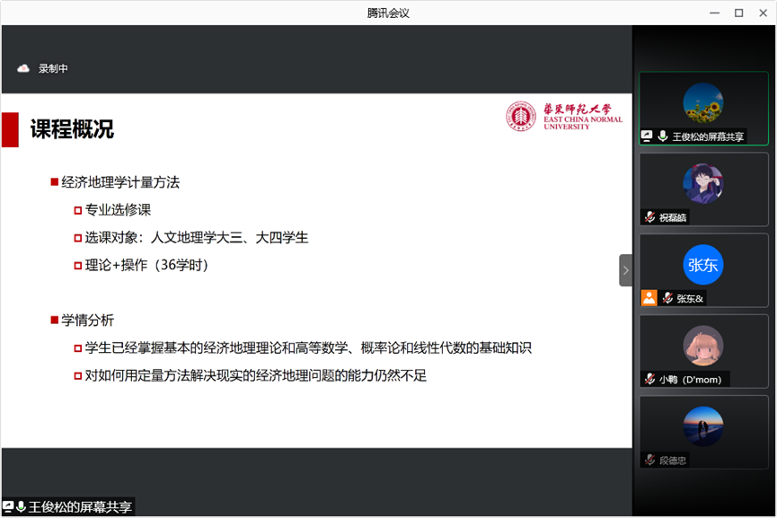 王俊松老师对自身的开设的《经济地理学计量方法》从课程概况、课程目标、教学内容、教学方法以及教学反思等方面进行了分享与探讨。王俊松老师指出,目前教学的难点在于内容较多,理论课时较多,应用课时不足,需要改革课程设置,平衡教学时间。同时为了深化学生对知识的掌握,要增加对前沿论文等案例的解读,也要增加对学生创造性思维的考察比重,建立多维的评价体系。