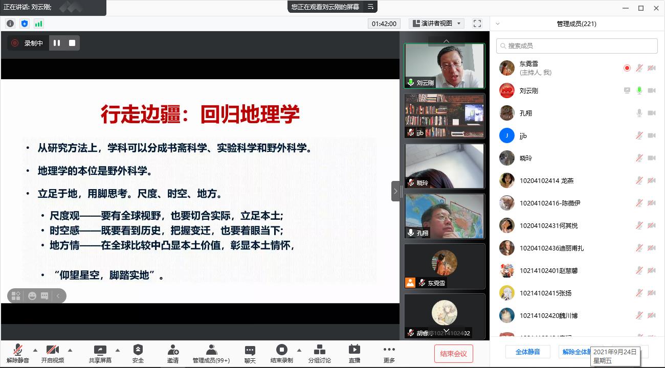 2021年9月24日星期五下午,城市与区域科学学院借助腾讯会议网络平台召开了本学期第三场“著名学者与本科生面对面”系列讲座,活动有幸邀请到华南师范大学地理科学学院院长、中国地理学会副秘书长刘云刚教授,为全院师生分享了从陆地到海洋不一样的边界研究。本次讲座由城区学院副院长孔翔教授主持,吸引了校内外师生200余人。