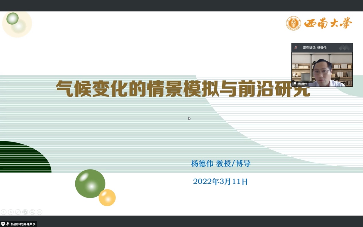 西南大学杨德伟教授应邀作题为“气候变化的情景模拟与前沿研究”的学术报告。杨德伟教授长期致力于地理学、生态学、经济学、可持续科学等交叉学科研究。学院杜德斌教授、胡志丁研究员、蒋雪中副教授、王俊松副教授、孙燕铭副教授、李春兰副教授、段德忠副教授等我院多位老师、博士后和博士研究生参加了本次线上讲座。
