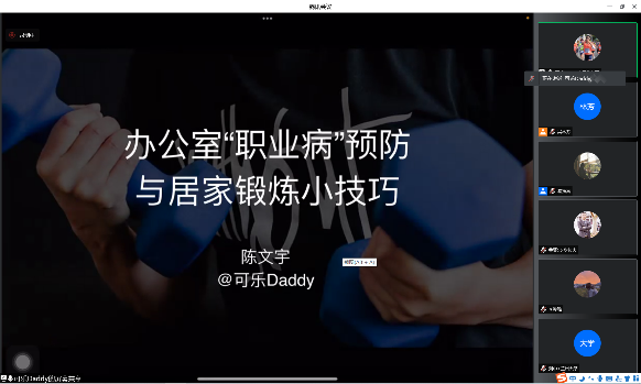 聚焦居家锻炼小技巧的提升,2022年5月8日,由华东师大城市与区域科学学院党委主办,华东师大城市发展研究院党支部、城市与区域科学学院经济地理系教工党支部、城市与区域科学学院普陀校区研究生党支部承办的“党建引领,健康同行”主题党日活动在线上顺利举行。本次活动邀请到国家职业健身教练、青少年体适能教练资格证、佳明跑步教练陈文宇老师给师生们带来了《办公室“职业病”预防与居家锻炼小技巧》的专题讲座,吸引了来自华东师范大学、武汉大学、安徽大学等近百名师生参加,活动由城市发展研究院党支部宣传委员易臻真副教授主持。