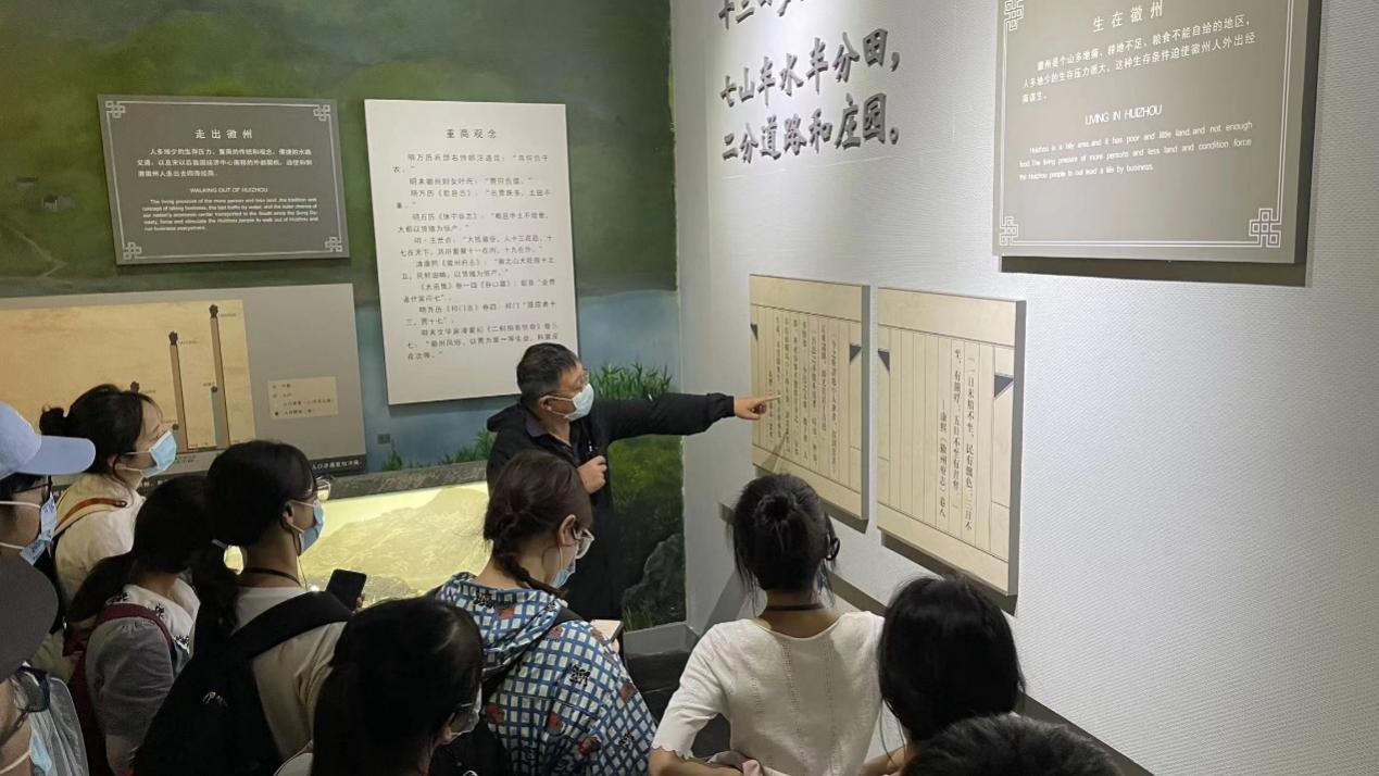 下午,师生一行前往中国徽州文化博物馆,感受徽州文化的博大精深,并在孔翔老师的全程导览中,从人地关系的视角体会徽文化及其各类特质的形成机制。在观看了黄山市的相关宣传片后,师生们正式进入博物馆参观学习。在两个小时的时间里,孔老师从徽州“八山半水半分田,一分道路与庄园”的地理条件讲起,生动阐释了徽商与徽文化的形成与发展过程。随着博物馆的布展移步换景,实习师生从经济、文化、社会、宗族、科技等多方面,全方位感受到徽州各类地方文化特质的整体性及其与地理环境的关系。